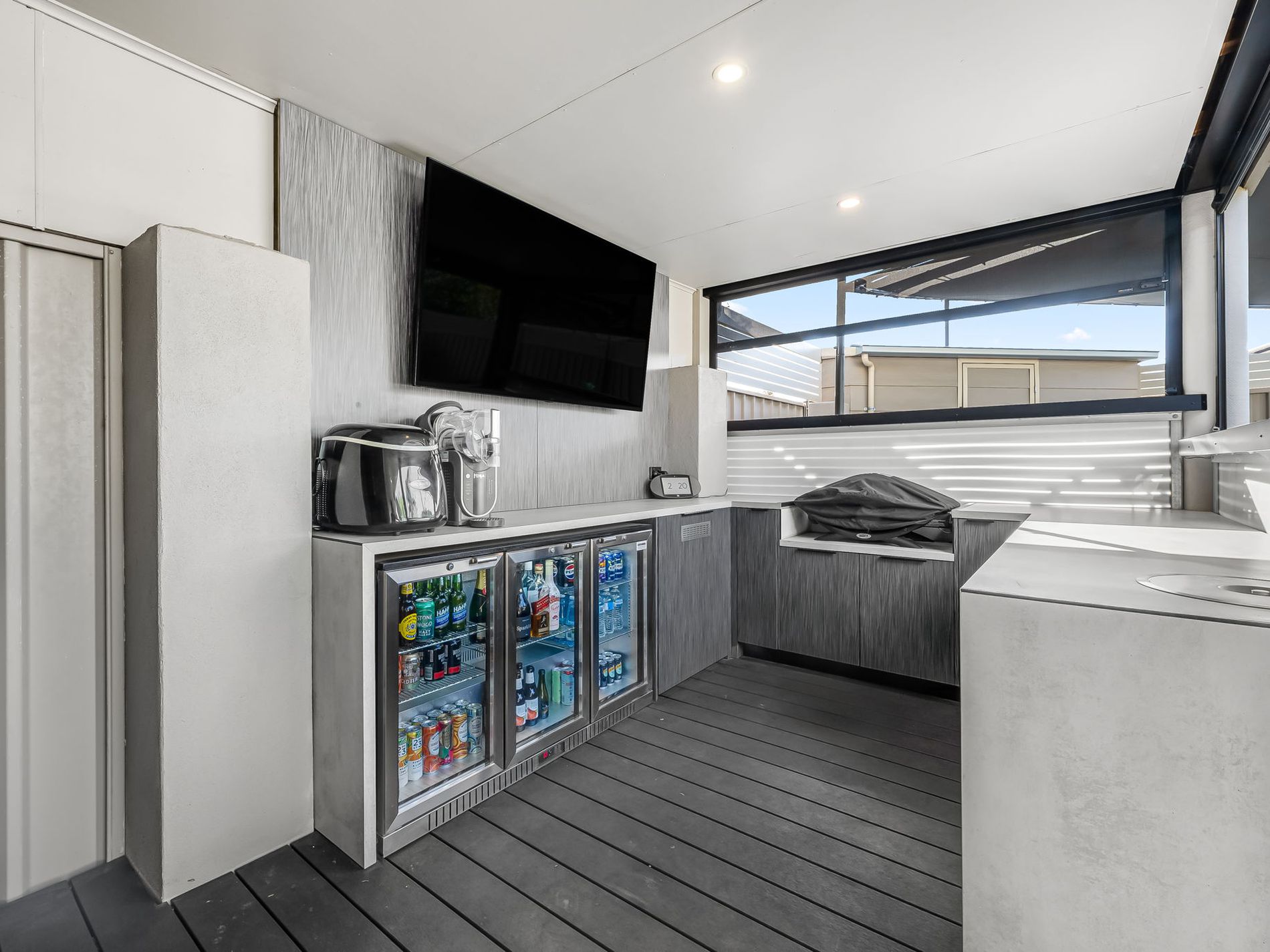- Outdoor entertainer's kitchen with built-in bar and BBQ space overlooking the pool and decking area
